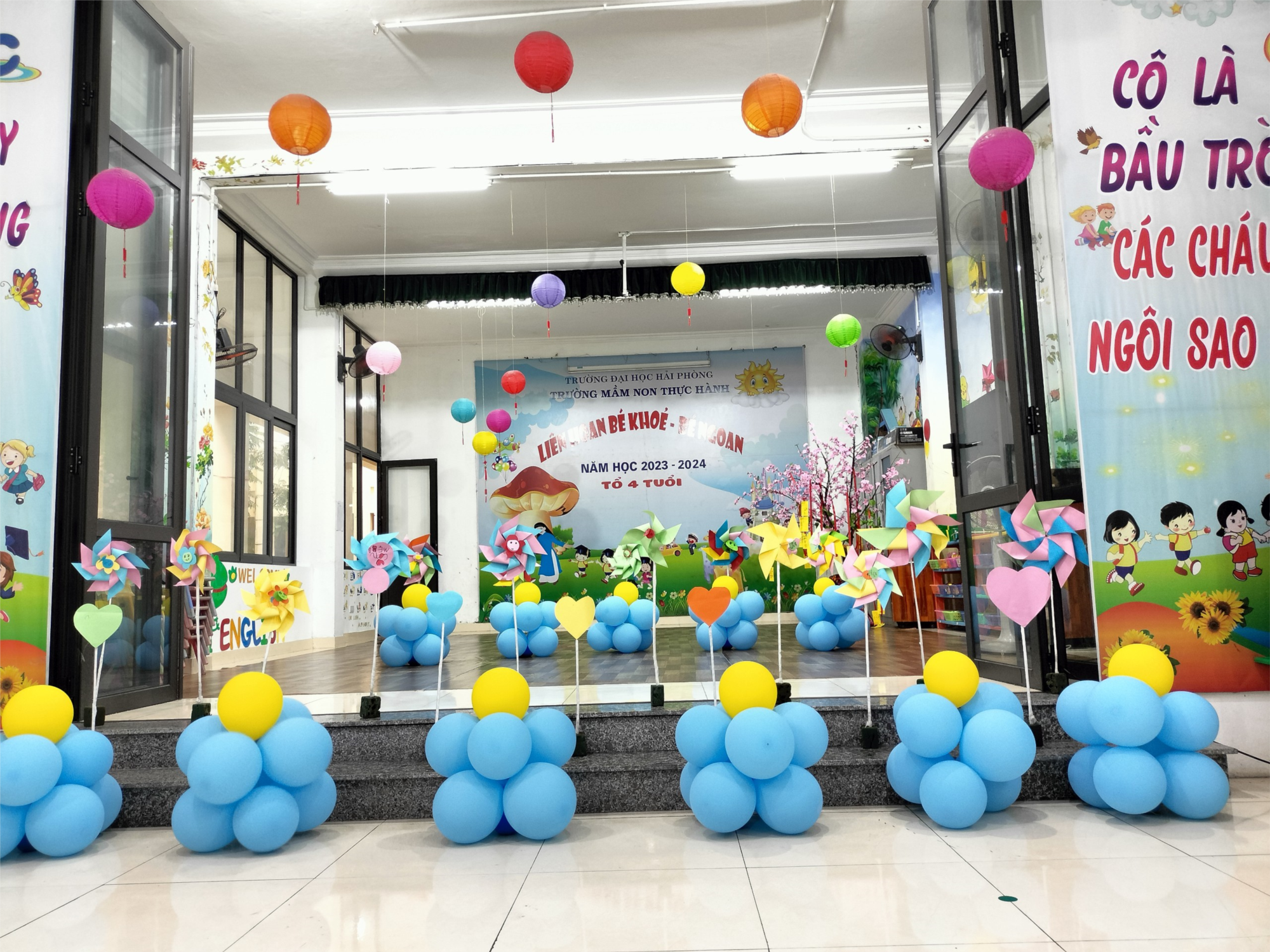 Khi khắp phố phường tiếng ve kêu gọi hè về và khi những chùm phượng rực cháy trên những lùm cây cũng là lúc báo hiệu một năm học sắp kết thúc. Một năm học với rất nhiều sự cố gắng, nỗ lực của cô và trò. Các bé lớn hơn, ngoan hơn, biết giúp đỡ và làm những việc phù hợp với khả năng của mình. Ngày hôm nay các bé sẽ được thể hiện tài năng, sự thông minh, nhanh nhẹn, khéo léo khi tham gia vào sân chơi “Bé khỏe- Bé ngoan” với thật nhiều trò chơi bổ ích, lý thú. Chúc các bé nhanh nhẹn, tự tin và giành chiến thắng trong sân chơi ngày hôm nay!
